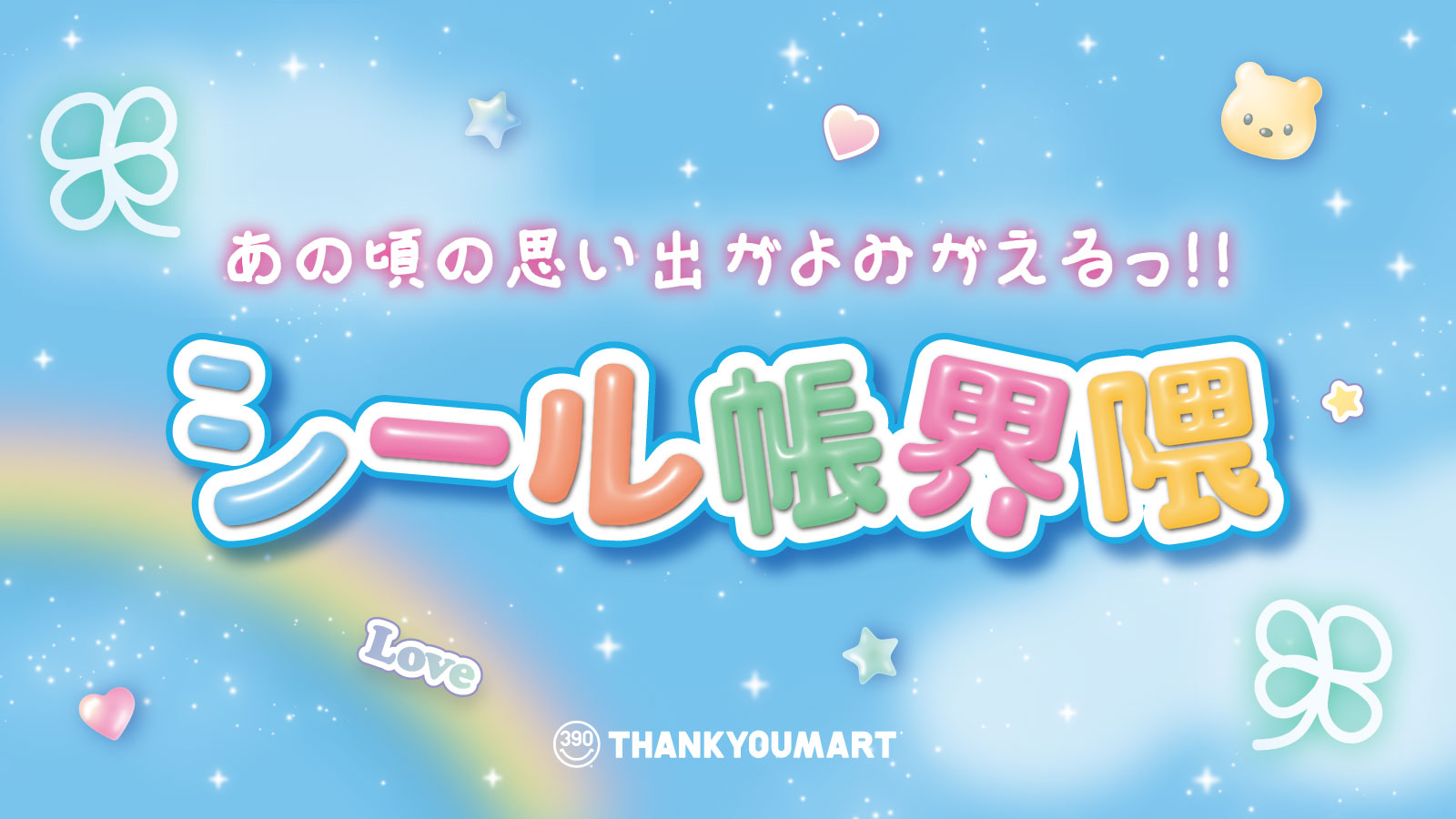 「サンキューマート」はキャラクターの限定アイテムを中心としたカワイイ推しグッズがいつ来てもALL390円で手に入るショップ。Tシャツやバッグ、アクセにコスメ、生活雑貨やお菓子…。ワクワクするような商品を、手に取りやすい“サンキュープライス”で揃えています。