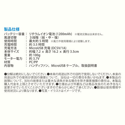 内容物:ハンディファン、MicroUSBケーブル、取扱説明書